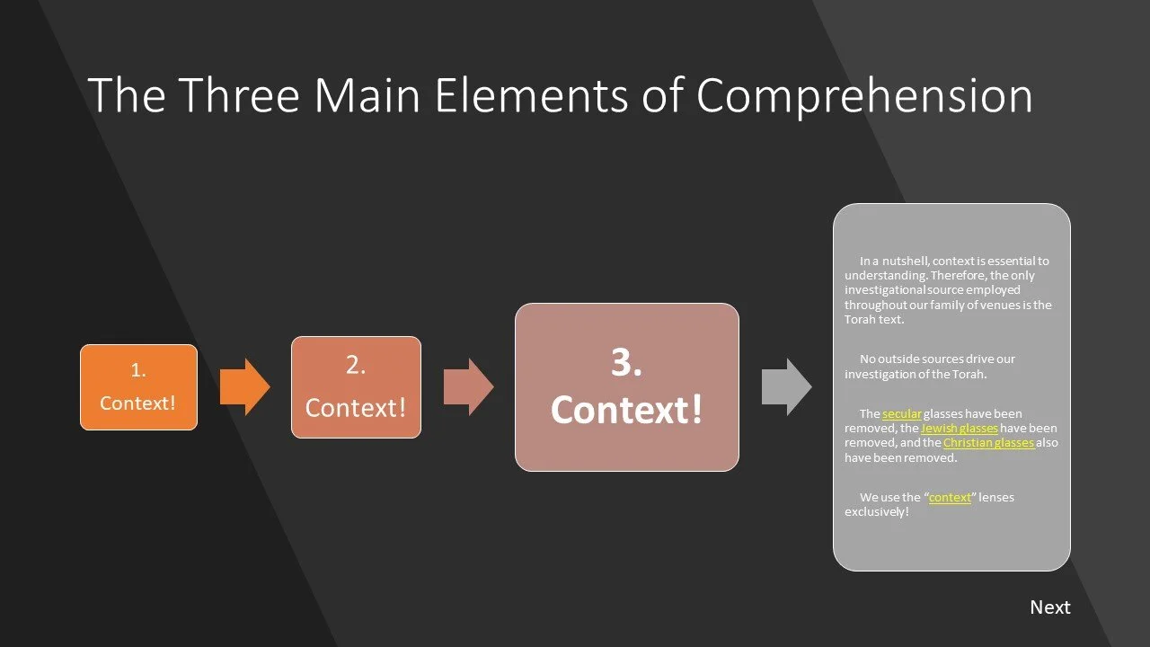 Aside from the proper vocalization of the sounds, the second most crucial aspect of the Hebrew language and the Torah text is CONTEXT! CONTEXT! CONTEXT! It is impossible in both ancient Hebrew, and modern Hebrew to understand what is being communicated if one ignores the context. One of the foundational principles of "misinformation" is to take something out of context. Taking something out of "context" is one of the first subtle steps taken to "malign" the Torah, and The Creator.